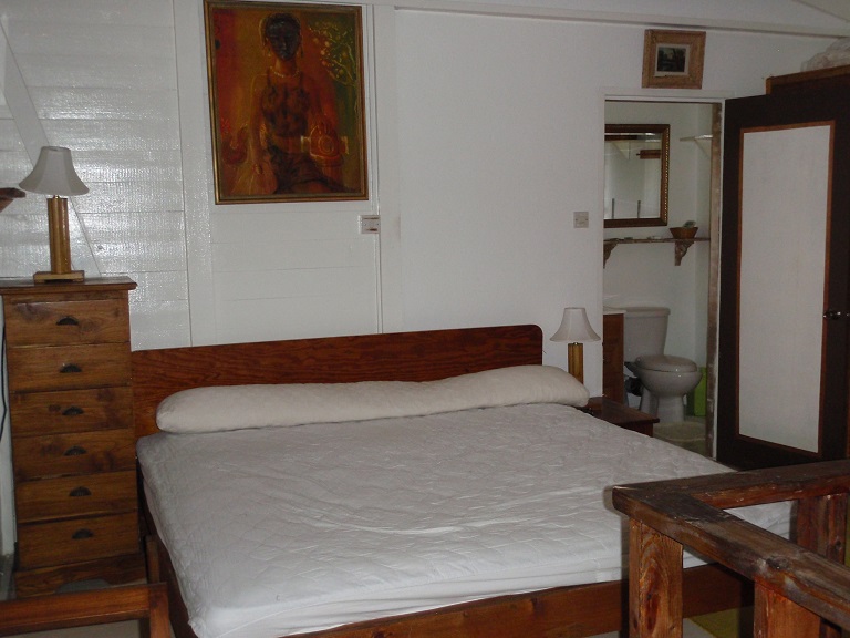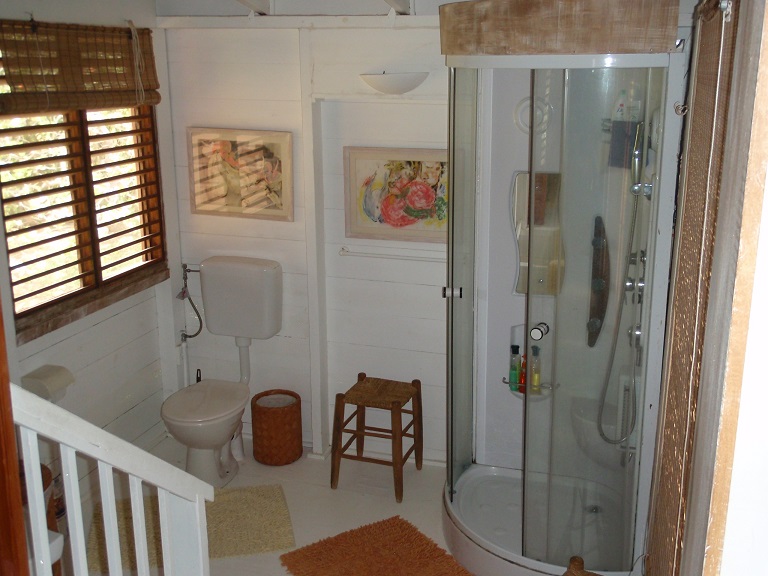 A living room, dining room and den downstairs all surround the central kitchen area, which in turn leads out onto the patios and towards the swimming pool. A lovely view between mature fruit trees and out to Gros Piton in the distance, and the Caribbean Sea to the south and west, provides a very scenic backdrop to the patio and pool areas. There is a full guest bathroom downstairs with toilet, vanity and shower. A staircase leads from the den to the upper floor, which is a spacious area built of wood and featuring exposed rafters. An ingeniously designed moving louvered wall made of locally cut and sawn planks gives this area optimal flexibility: making it possible to create two private bedrooms each with ensuite private bathrooms or, alternatively, create a large space where energy flows unhindered while still providing nooks of privacy. Wooden louvres on the windows filter the light and keep the area cool, while glass panes beyond the louvres protect the interior from the elements and insects. Glass sliding doors lead from the upstairs sitting area into a light and cozy office space which doubles as a gym. This, in turn, opens out through tinted glass sliding doors to the upstairs balcony with its very privately set open-air jacuzzi.