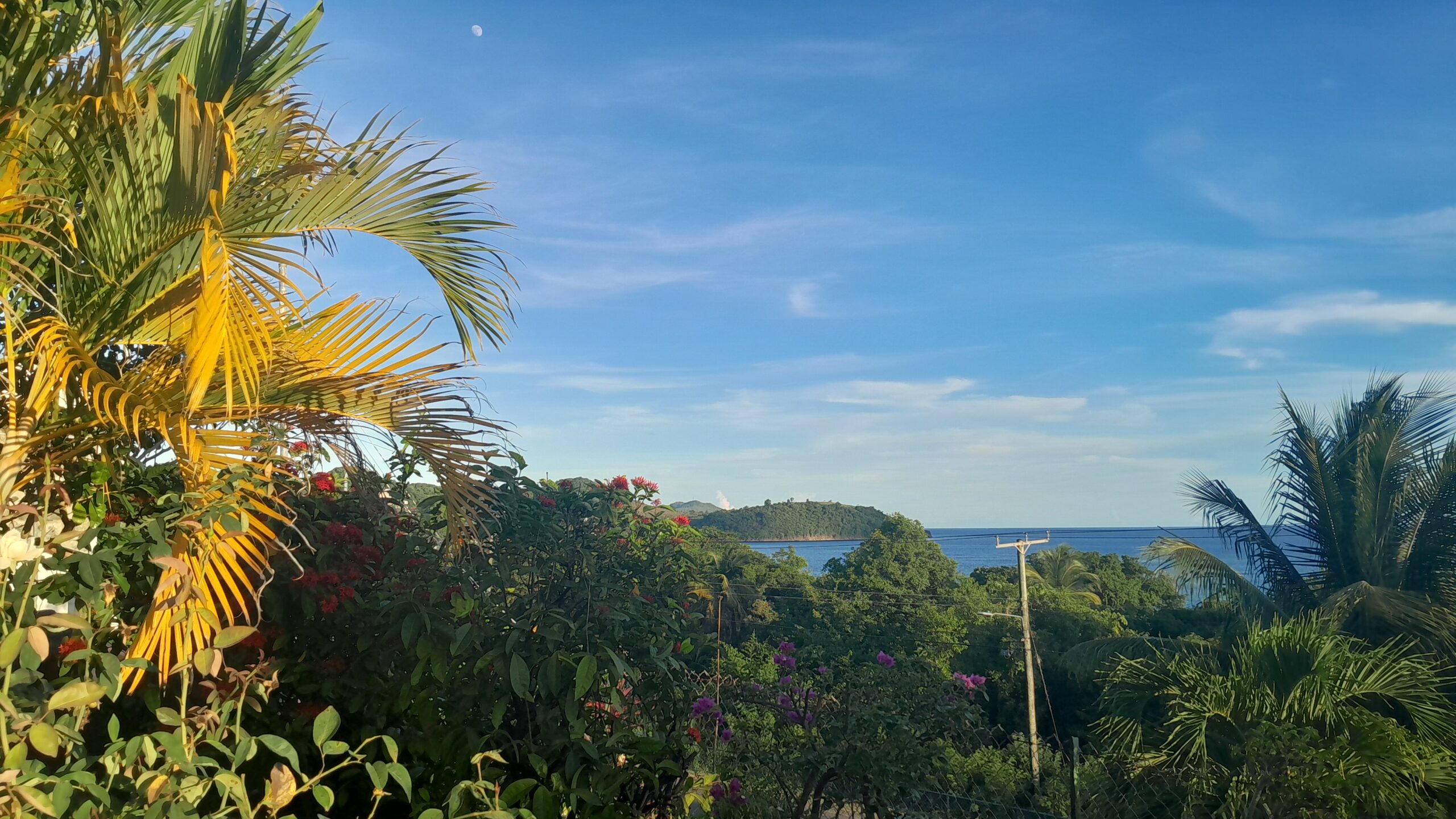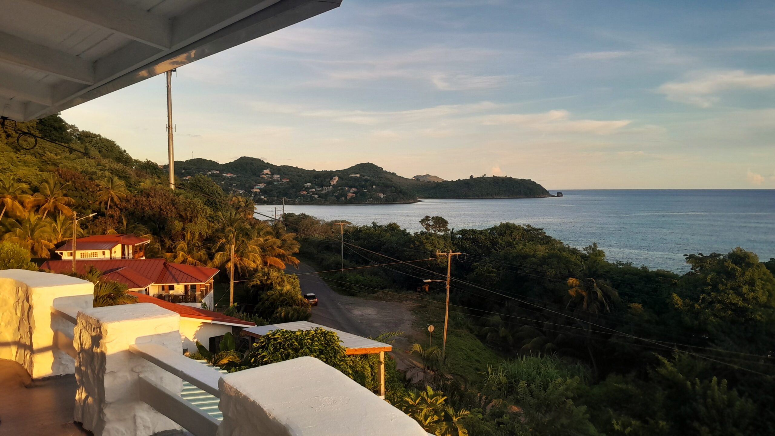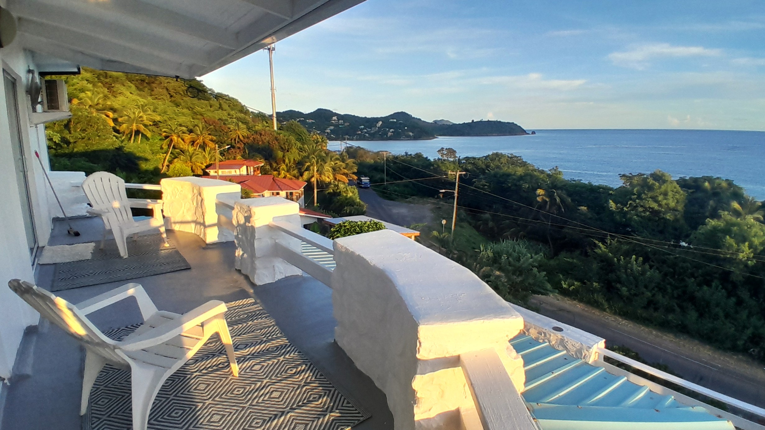 The main house is arranged around a central wooden staircase, with the kitchen and dining area to the rear of the house, and the living room facing the Caribbean Sea. From the light and open living area, the 180-degree sea views command all attention. Glass sliding doors give way to a large outdoor deck. Cooled by north-easterly tropical breezes, this is undeniably the place to relax. Here, the sight of the sparkling blue Caribbean Sea beyond a fringe of green palm fronds combines with the comforting rumble of waves breaking on the coral reefs out in Laborie Bay. A small peninsula breaks the sea view momentarily, only to open out again to more eye-filling distant blues and whites to the east and west. Due south are colourful fishing boats bobbing about in Laborie Bay and, in the distance lies the neighbouring island of St Vincent.