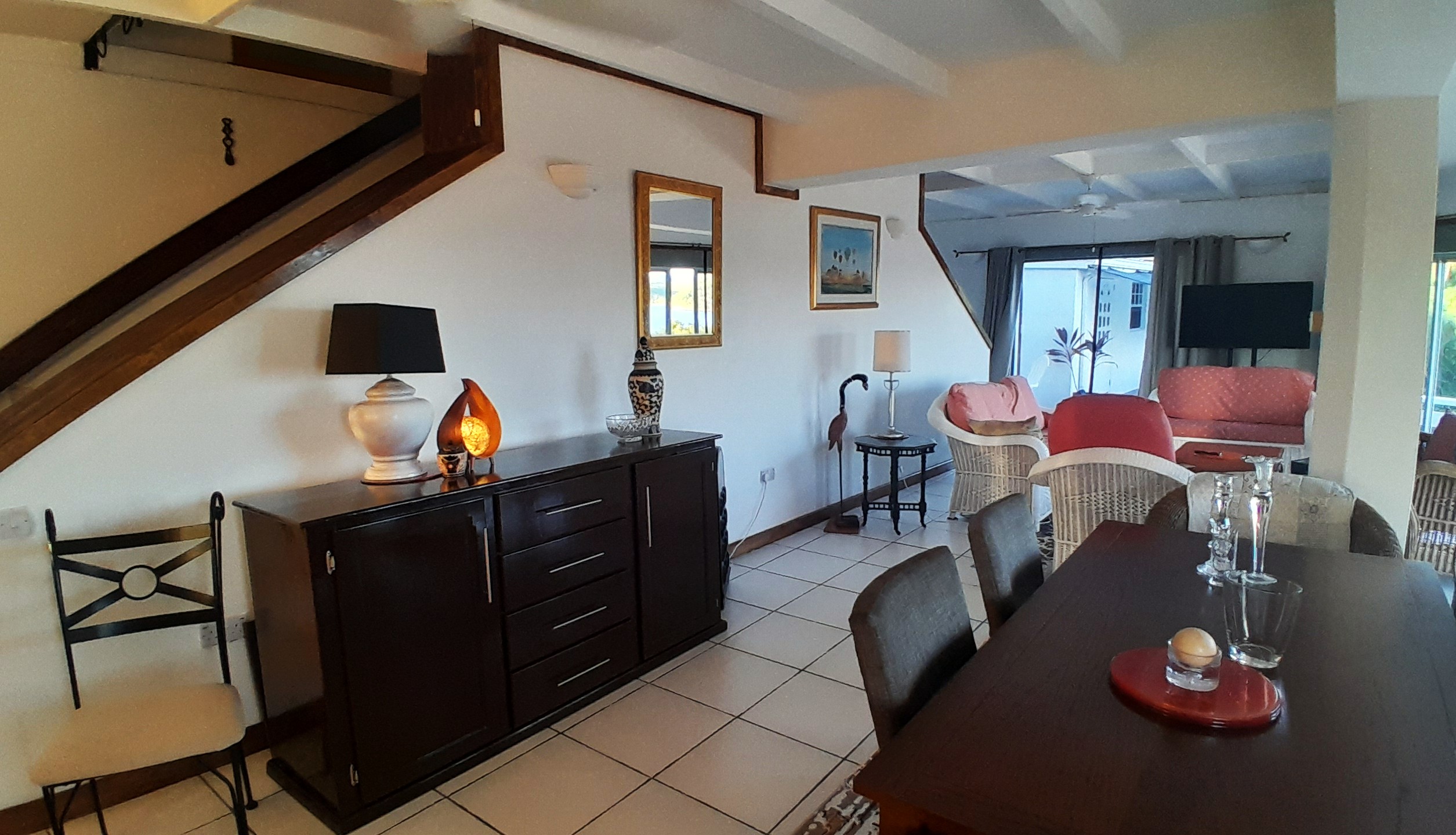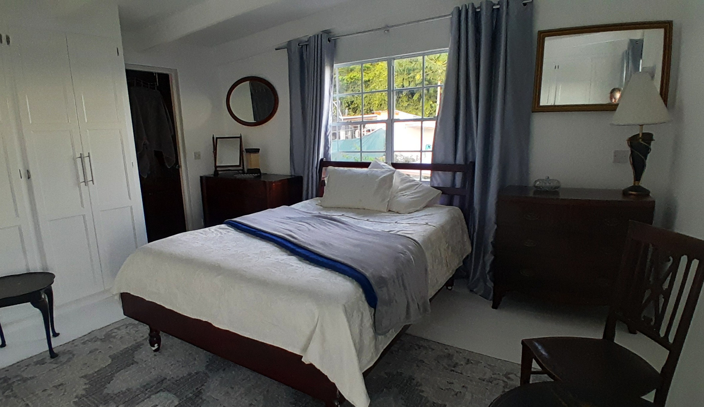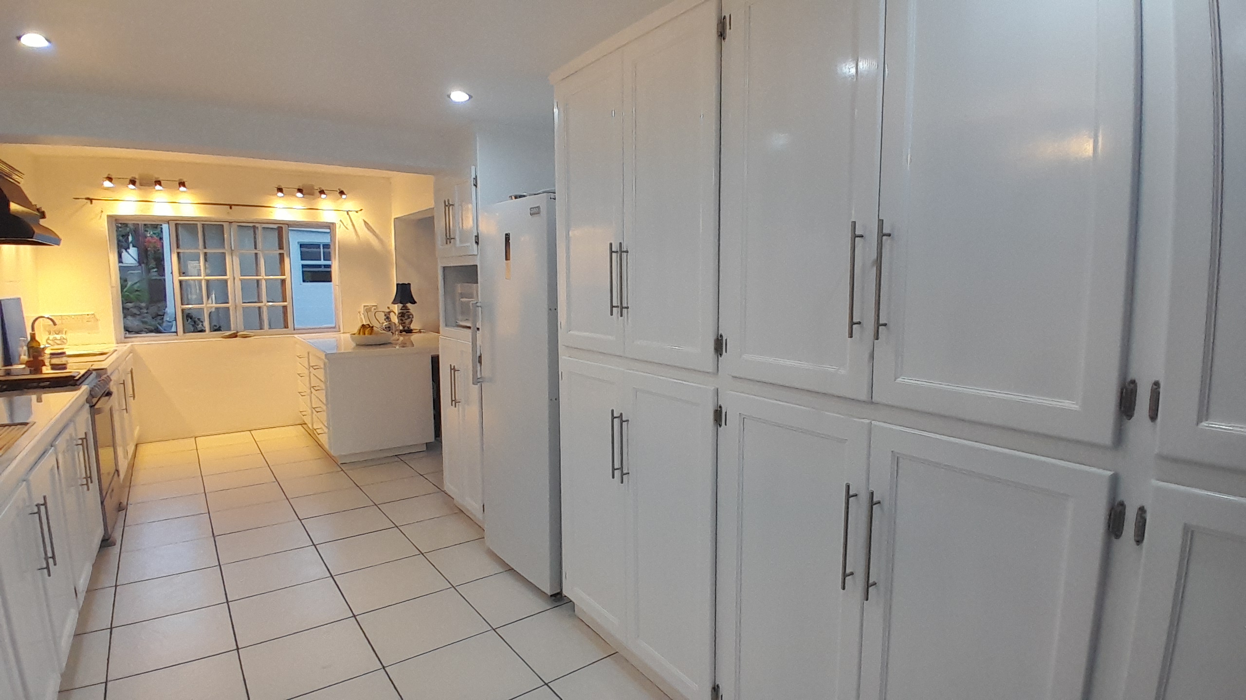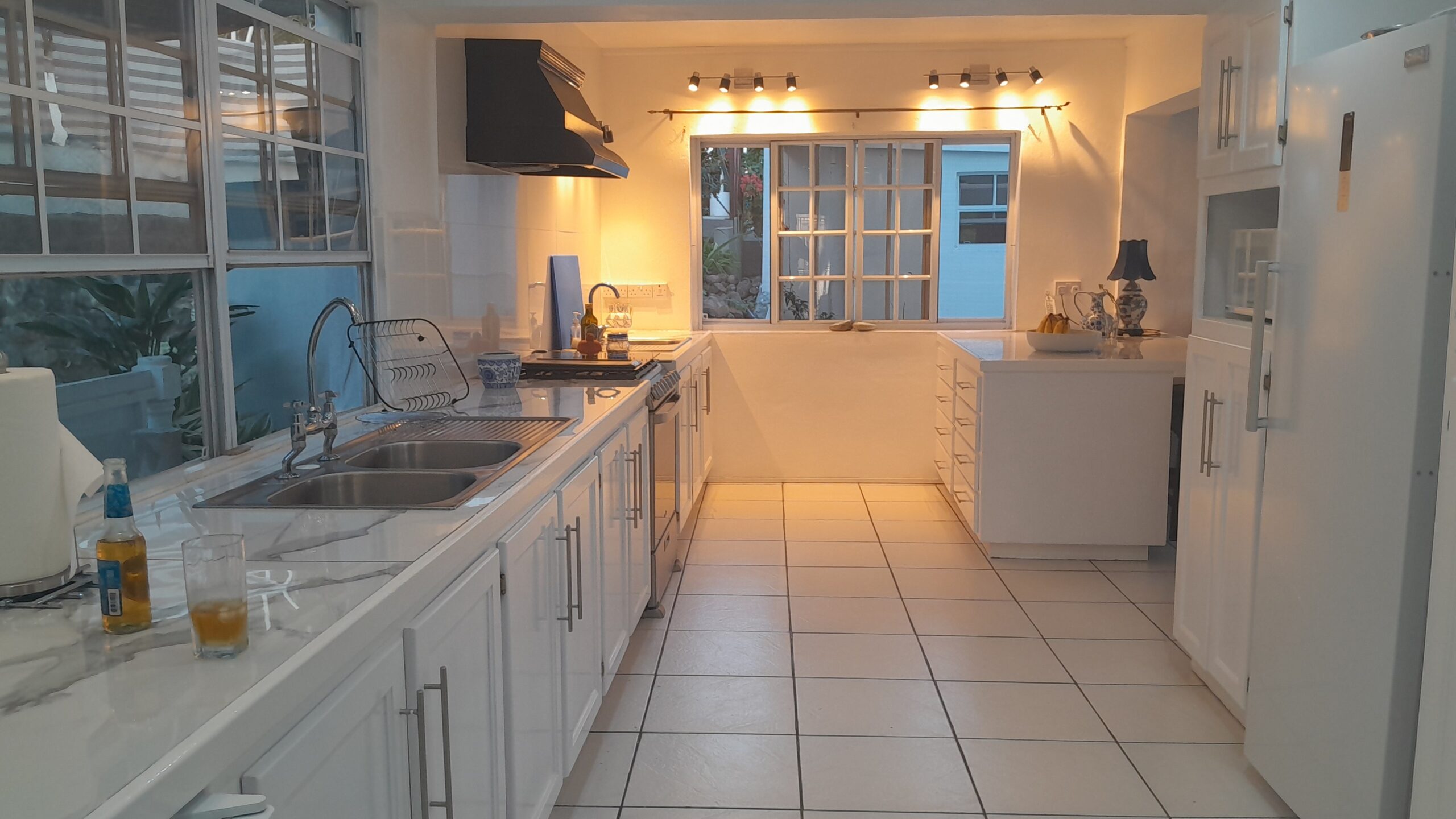 Inside, the living room bounds with a dining area, and open-plan kitchen. A white modern kitchen with recessed lighting give this part of the house a very clean look: a haven of homeliness after the sunshine outdoors. On one side, the kitchen opens out into the hallway adjacent to the main entrance door. A guest bathroom adjoins this hallway. The other side of the kitchen opens out onto a sheltered garden area with a neat little laundry room, and outdoor seating space. Shade, breeze and a meticulously landscaped kitchen and flower garden obviously make this a much-loved place for cups of tea and morning coffee! Behind the main house, extensive well-maintained garden paths allow access to the higher level, where bountiful mango trees are interspersed with vegetable and flower beds.