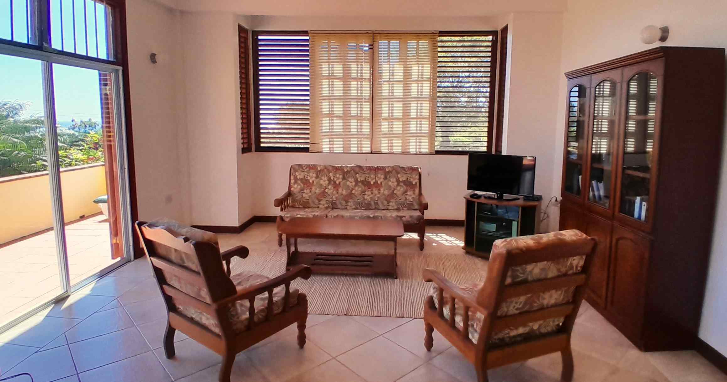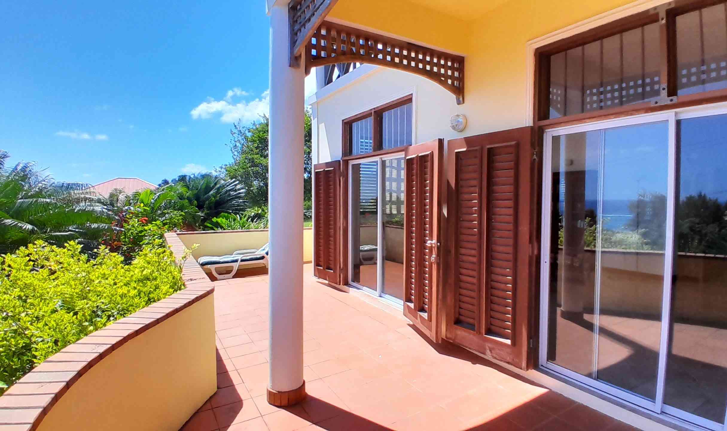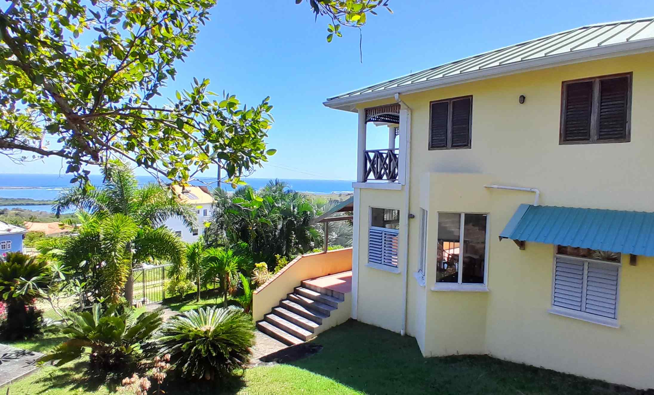 A large, open-style living room with a dining area and an open kitchen, overlooks the tropical garden. Beyond the palm trees lie the sprawling vistas of Savannes Bay with its beaches, mangroves and off-shore island and, in the distance to the South, Maria Islands, Sandy Beach and the Moule a Chique peninsula. Despite established neighbours on two sides of this property lending a safe and established residential feel, what an impressive view it is!