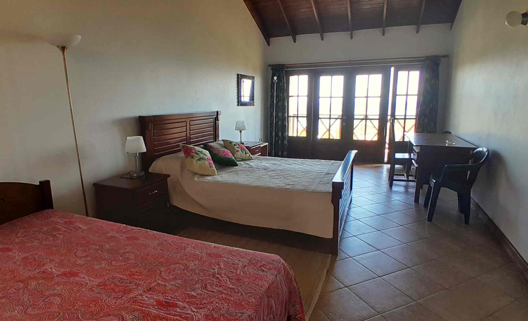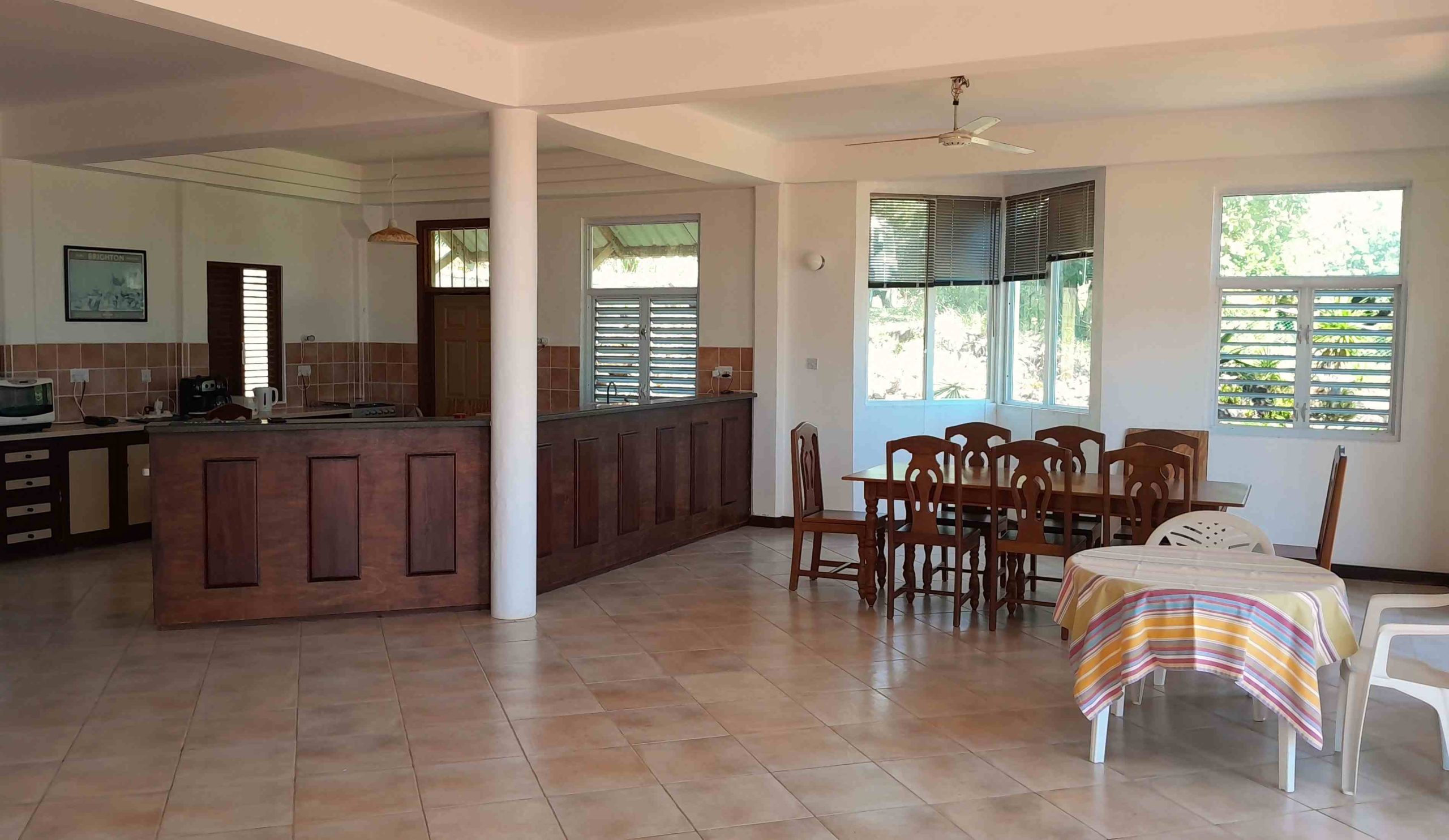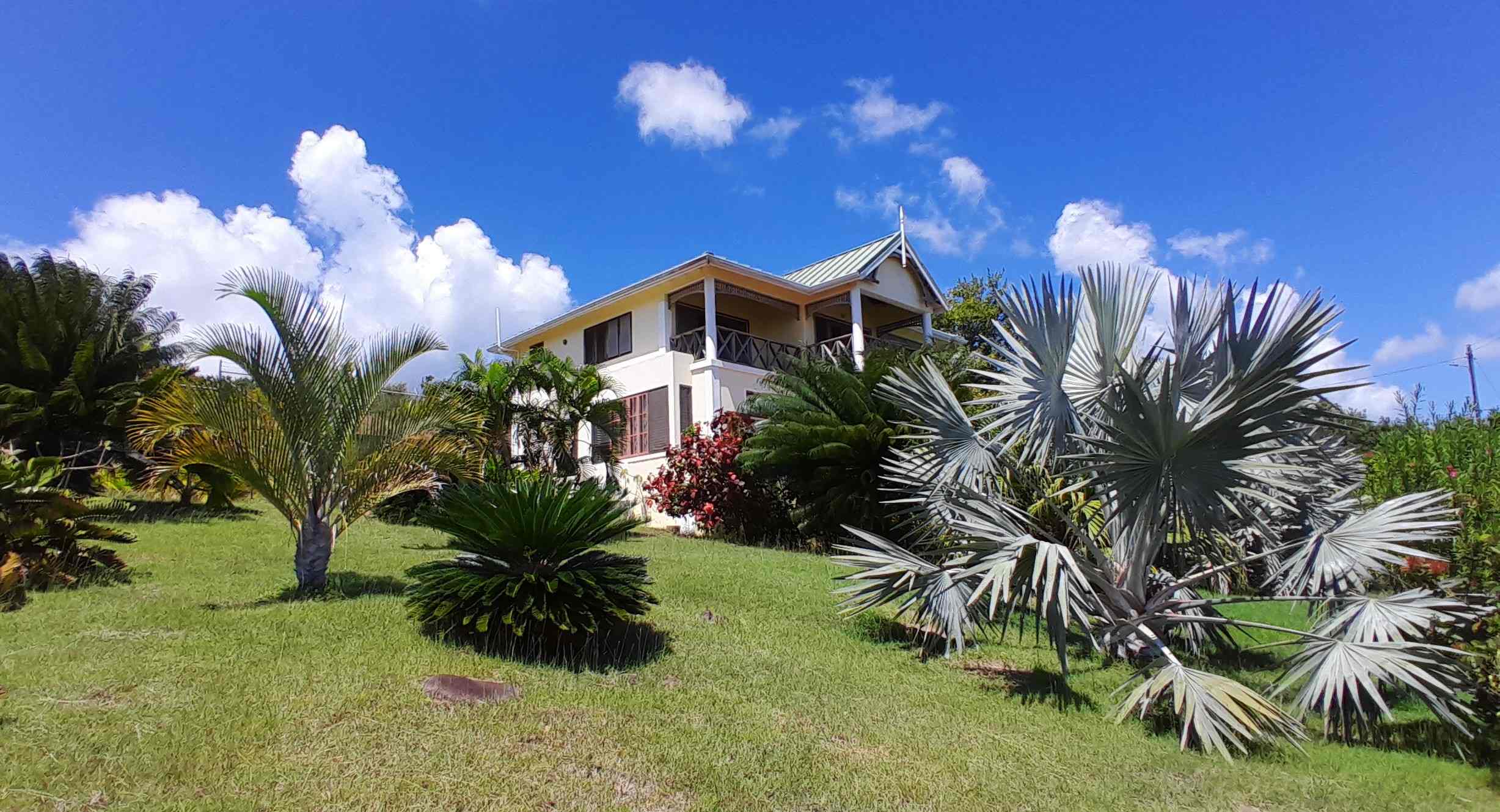 A large, open-style living room with a dining area and an open kitchen, overlooks the tropical garden. Beyond the palm trees lie the sprawling vistas of Savannes Bay with its beaches, mangroves and off-shore island and, in the distance to the South, Maria Islands, Sandy Beach and the Moule a Chique peninsula. Despite established neighbours on two sides of this property lending a safe and established residential feel, what an impressive view it is!